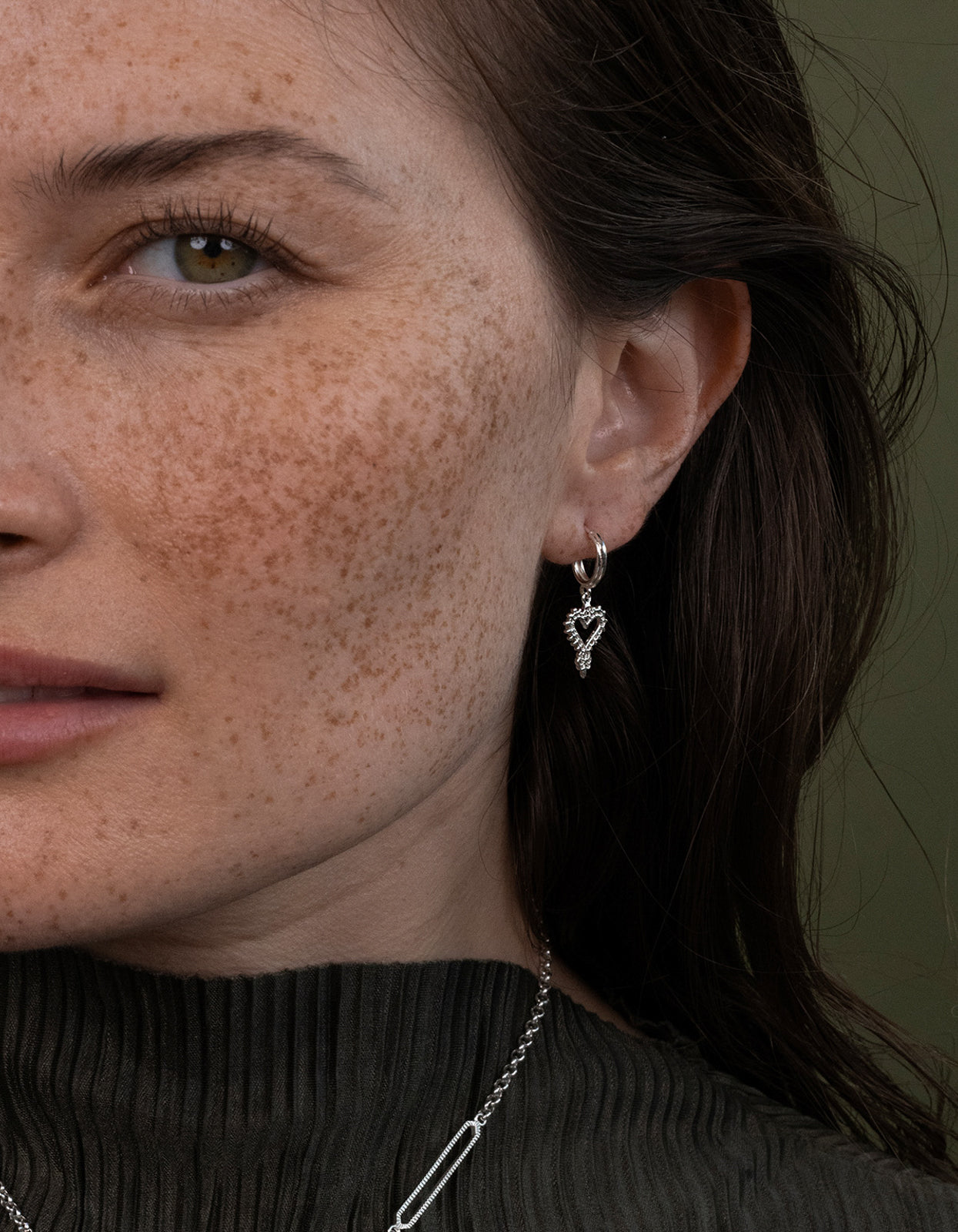 These silver earrings feature a miniature heart pendant, gracefully suspended from a beautifully textured hoop. They gently sway, capturing the essence of bohemian grace and timeless romance. Consciously crafted from recycled 925 Sterling Silver, these Mini Gypsy Heart hoops are inspired by the beauty of Spanish lands, celebrating feminine charm and wanderlust.